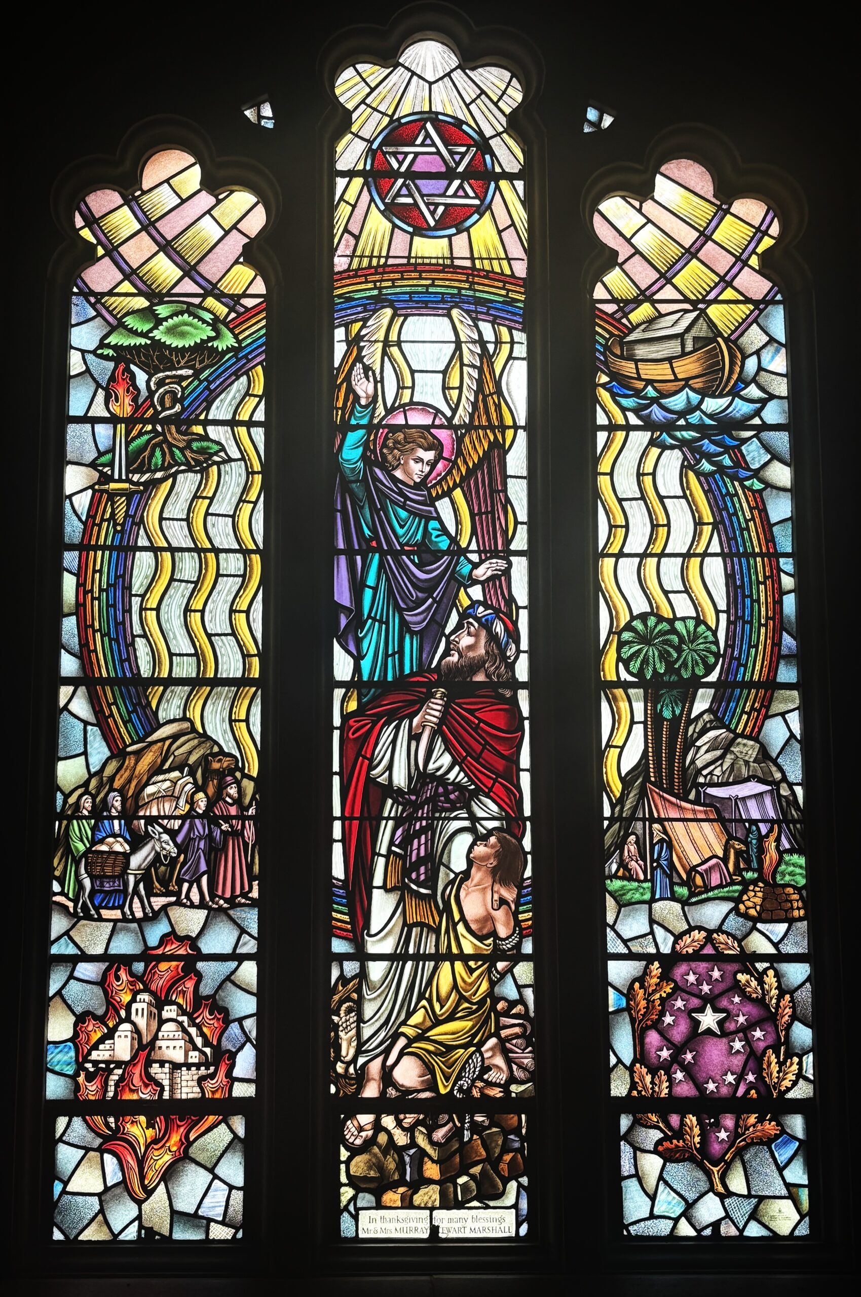 En el transepto sur, a la derecha según se mira hacia el altar mayor, hay dos ventanas que representan a Abraham y Moisés. En la ventana de la izquierda del transepto sur se muestra a Abraham en el momento en que intervino el ángel, justo cuando iba a sacrificar a su único hijo Isaac, según se relata en el capítulo 22 del Génesis. Las escenas circundantes simbolizan la expulsión del Jardín del Edén, el vagabundeo del pueblo de Israel por el desierto, la destrucción de Sodoma y Gomorra, el arca de Noé (que es también un símbolo de la Iglesia) y un símbolo de la promesa de Dios a Abraham de hacer su descendencia "tan numerosa como las estrellas del cielo" (las estrellas están rodeadas por las hojas de roble de la fidelidad). Todas estas imágenes están contenidas y unificadas en el símbolo del arco iris, la primera alianza de Dios con su pueblo elegido. Por encima de todo está la estrella de David, que simboliza tanto la fe judía como los seis días de la creación.