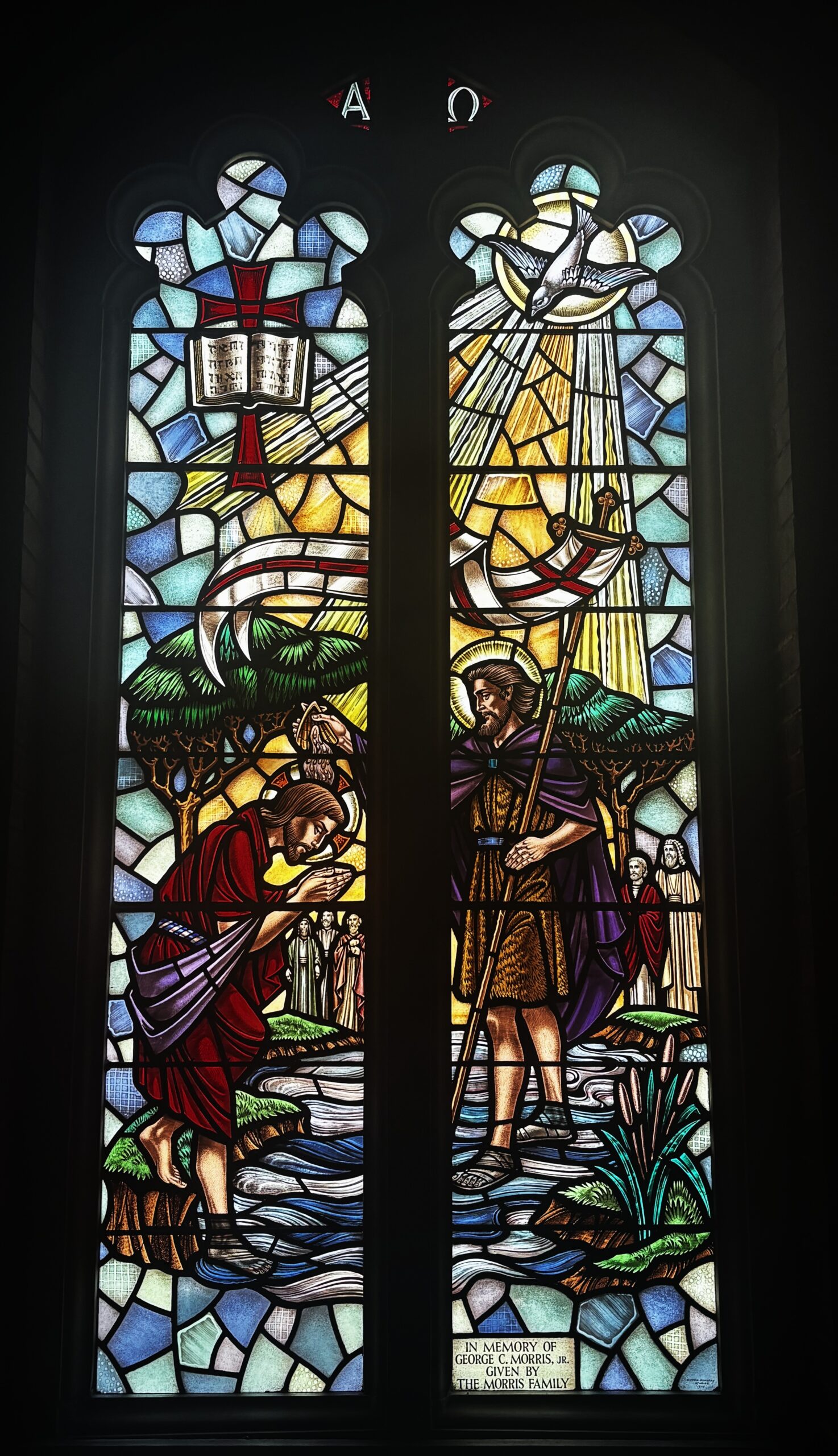 A la derecha del gran ventanal occidental se encuentra la representación del bautismo de Jesús por Juan el Bautista, tal como se relata en los tres Evangelios sinópticos (Mateo, Marcos y Lucas). La paloma simboliza el Espíritu de Dios descendiendo sobre Jesús y diciendo "Este es mi Hijo amado". El libro y la cruz simbolizan la palabra de Dios. En la parte superior de la ventana se encuentran los símbolos A y W, Alfa y Omega, el principio y el fin.