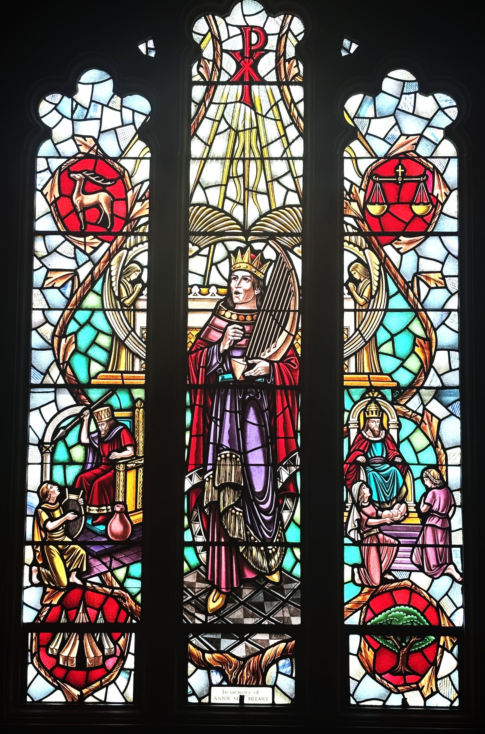 En el lado sur de la nave hay tres ventanas que representan a David, Isaías y la Anunciación. En la imagen central de la primera ventana aparece David, el salmista, tocando el arpa delante del Arca de la Alianza. En la escena de la izquierda, más pequeña, se ve al joven David tocando para el rey Saúl, que le amenaza con una espada. David sucedió a Saúl como rey de Israel, y su historia se encuentra en el primer libro de Samuel. A la derecha se muestra la sabiduría de Salomón, sucesor de David como rey de Israel, tal y como se encuentra en el primer libro de los Reyes. Estas imágenes están rodeadas y sostenidas por una representación del árbol de Jesé. En la parte superior de la ventana se encuentra uno de los monogramas sagrados, el Chi Rho, que representa a Cristo, anunciado por Isaías y llamado "brote del tronco de Jesé" en el capítulo 11 del libro de Isaías. Cuatro tribus de Israel también están simbolizadas en esta ventana: la tribu de Neftalí se muestra como un ciervo, la tribu de Gad está simbolizada por tiendas, el signo de la tribu de Dan es la balanza, y el árbol significa la tribu de Aser.