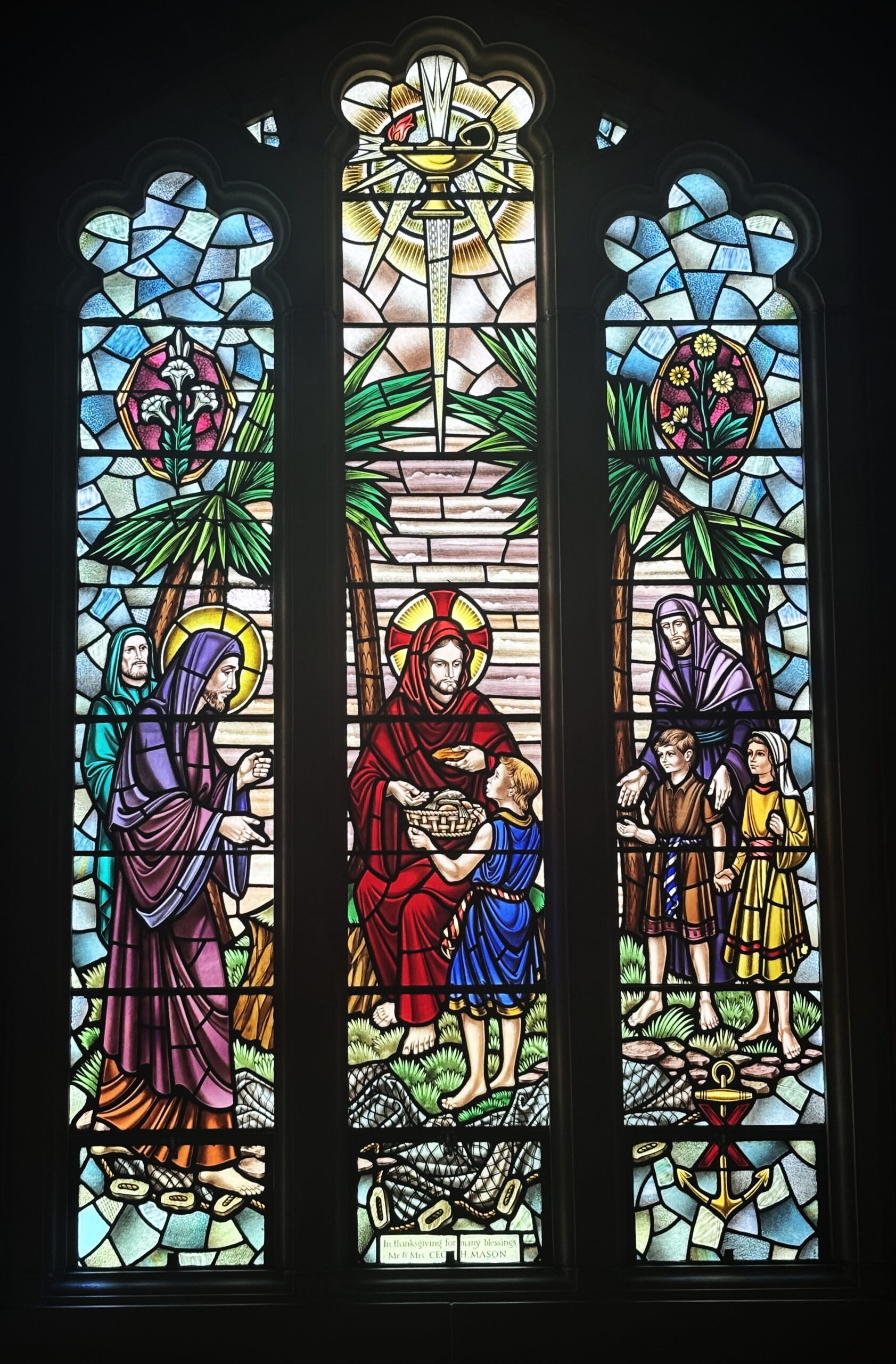 La otra ventana, en la pared norte de la nave, muestra la alimentación de la multitud, tal como se narra en los Evangelios sinópticos. Los símbolos de esta ventana incluyen la lámpara que nos recuerda que Cristo es la luz del mundo, los lirios por la pureza, las margaritas por la inocencia, la cruz ancla de la fe y la esperanza, y la red que simboliza a Jesús haciendo a los Apóstoles pescadores de hombres.