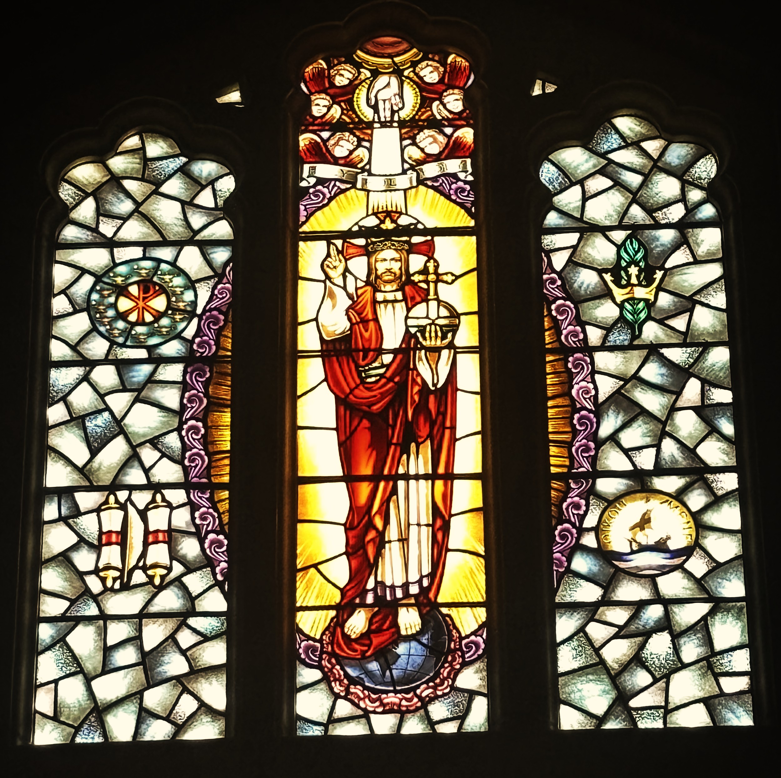 Sobre esta ventana hay otra más pequeña que representa el reinado de Jesús sobre la Creación. Jesús está de pie sobre el globo terráqueo, sosteniendo un orbe. Le rodean el rollo de la Ley, el monograma sagrado Chi Rho, una nave que simboliza la Iglesia, y una rama de palma rodeada por una corona de oro, símbolo de la resurrección.