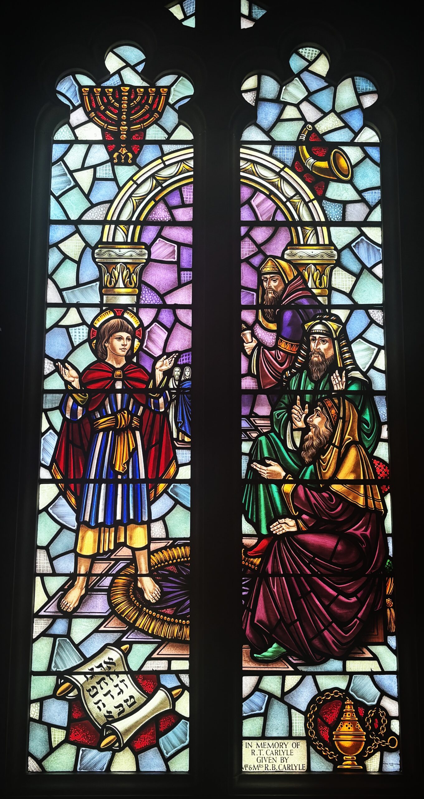 En la pared oeste, al fondo de la iglesia, hay tres ventanas. La ventana de la izquierda representa al joven Jesús predicando en el Templo y asombrando a los ancianos del Templo con su sabiduría, como leemos al final del segundo capítulo de Lucas. Es la primera vez que Jesús da a entender que es el Hijo de Dios, porque cuando sus padres le preguntan dónde ha estado dice que estaba "en los asuntos de mi Padre". A su alrededor hay símbolos de la fe y el culto judíos: los rollos de la Torá de la ley, la menorá de siete brazos, el shofar que llamaba a los fieles al culto y un incensario que simbolizaba la oración. Todos estos símbolos de la fe y el culto judíos sirven para recordarnos que Jesús es el cumplimiento de la Ley y los Profetas.