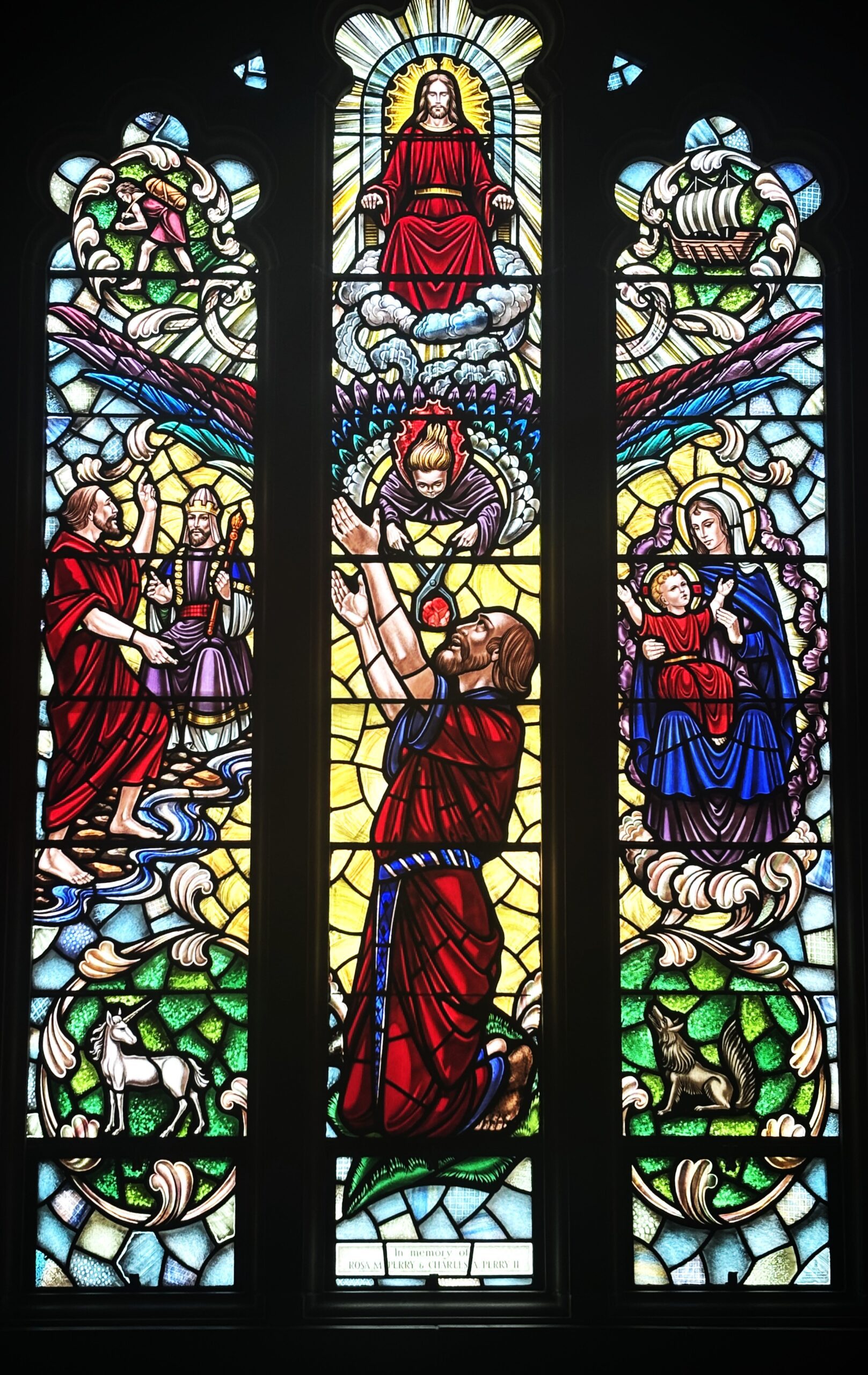 El gran ventanal oriental, situado sobre el altar mayor en la parte delantera de la iglesia, representa la vida de San Pablo. La imagen central representa la conversión de San Pablo, tal como aparece en los Hechos de los Apóstoles. Alrededor de esta imagen hay representaciones del martirio de San Esteban, en el que Pablo estuvo presente antes de su conversión, un barco rodeado de cadenas que simboliza el viaje de Pablo a Roma como prisionero, Pablo predicando el Evangelio, y una imagen de Pablo escribiendo las Epístolas, de nuevo rodeado de cadenas, lo que significa su cautiverio.