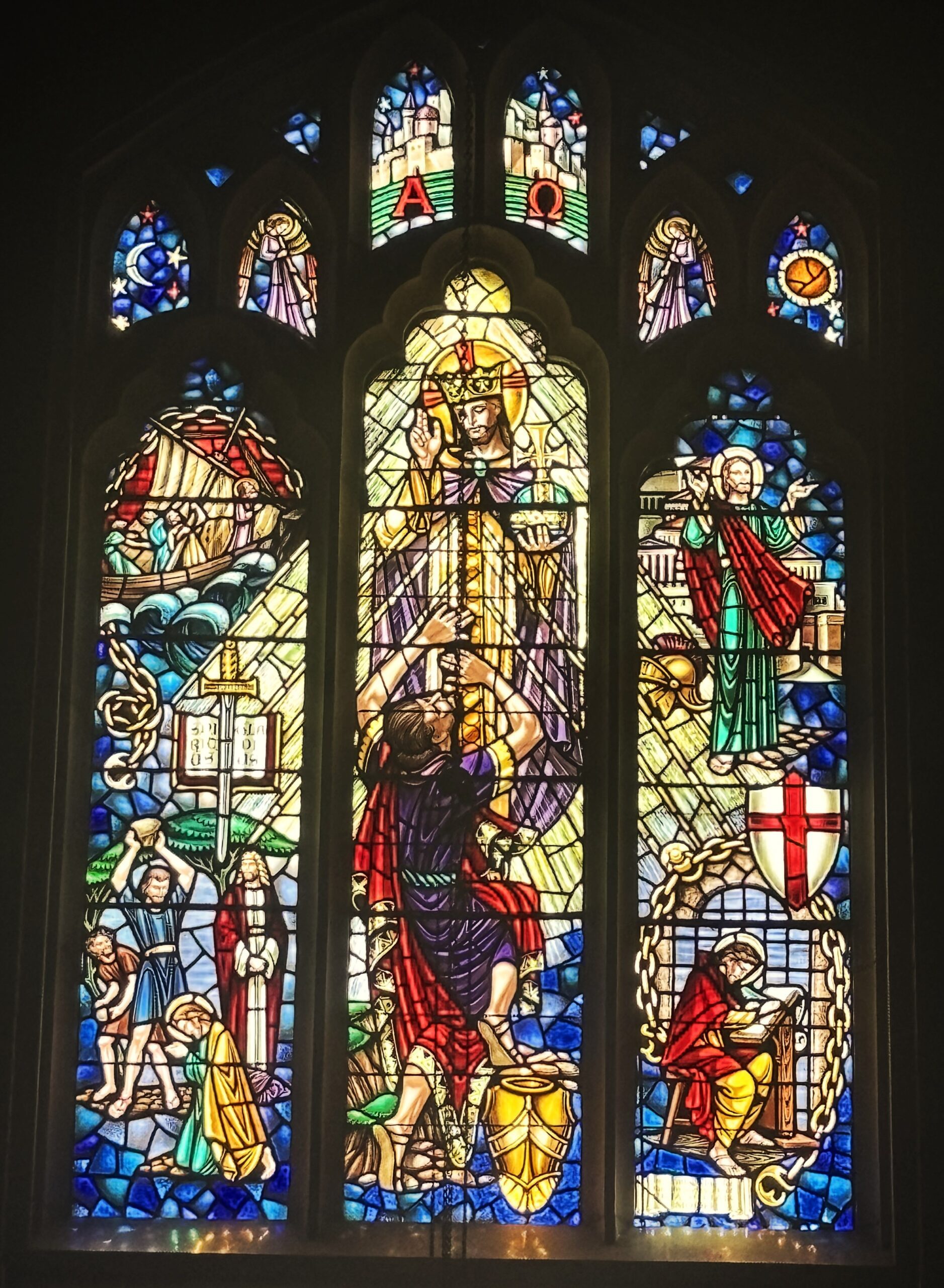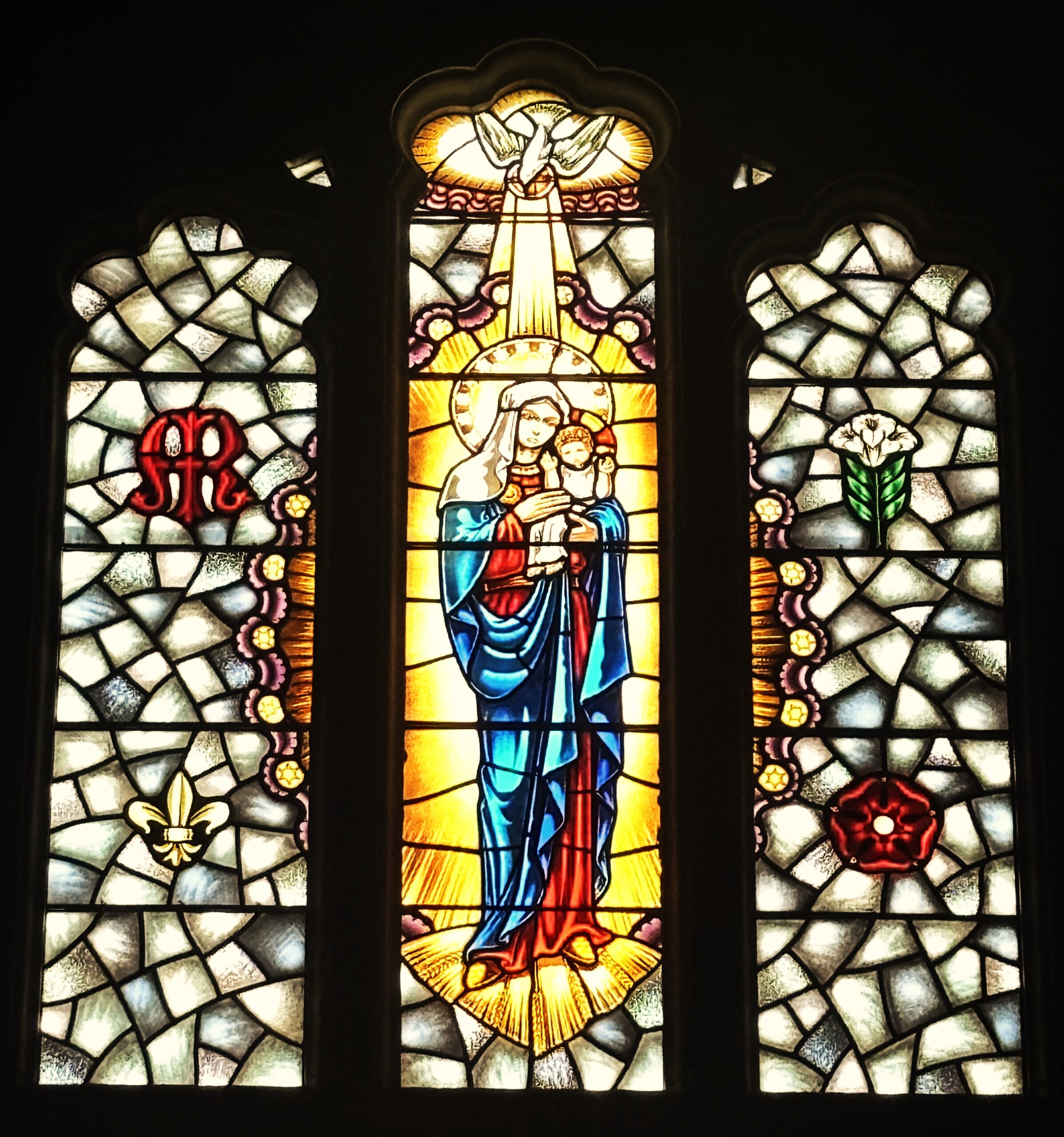 Hay tres encantadoras vidrieras en la Capilla de Nuestra Señora de Walsingham, que muestran la historia de Jesús en la Natividad a la izquierda, la Resurrección en el centro, y el Día de Pentecostés, cuando el Espíritu Santo, en lenguas de fuego, descendió sobre los Apóstoles para cumplir la promesa de Cristo de un Consolador a la derecha.