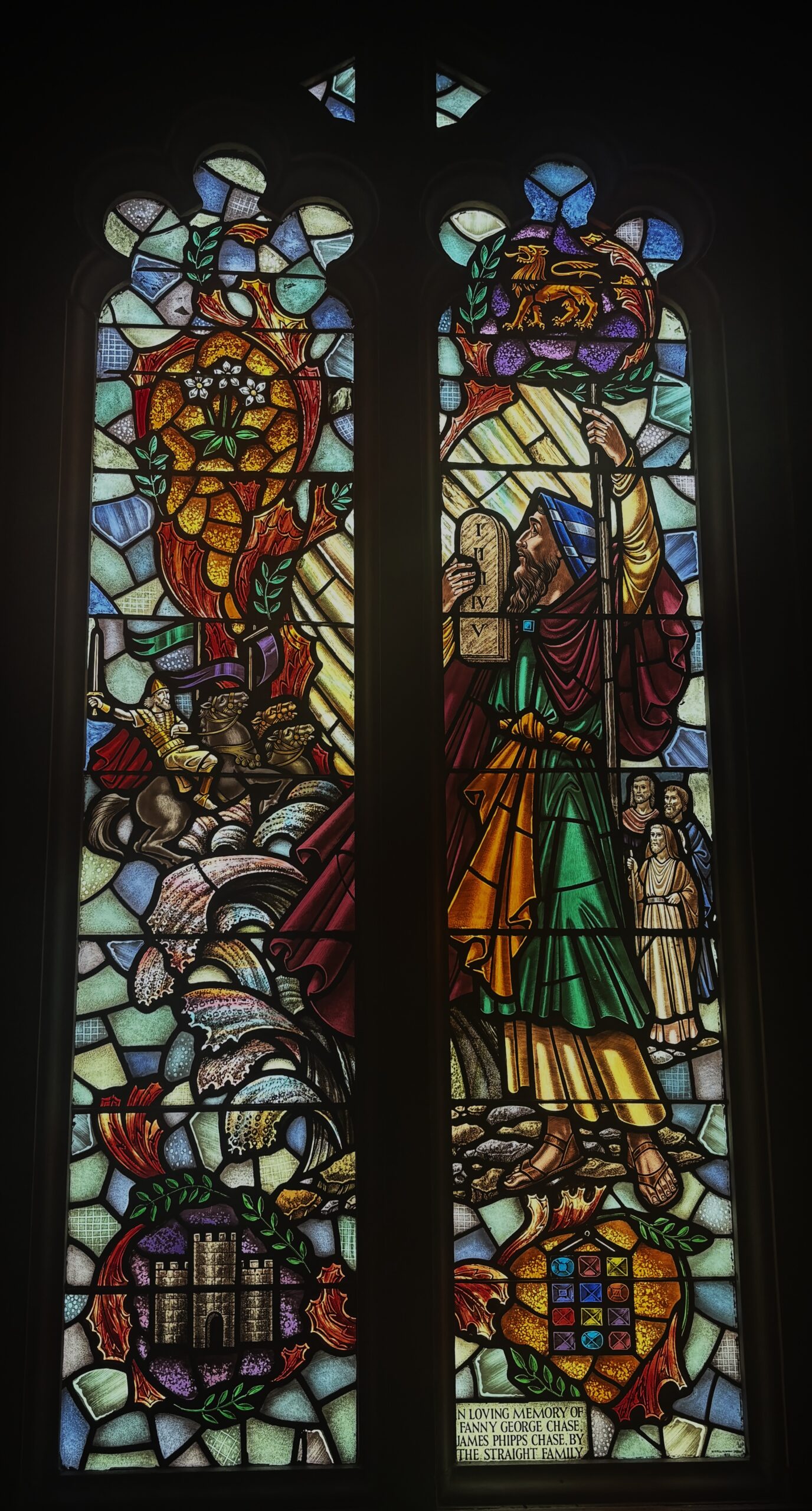 A la derecha de la ventana de Abraham está la ventana de Moisés. Moisés sostiene las tablas de la ley y guía al pueblo de Israel a través del Mar Rojo, perseguido por los carros del Faraón, como se relata en el capítulo 14 del Éxodo. Su llamada a la zarza ardiente está simbolizada por las llamas y las hojas del fondo. Esta ventana contiene símbolos de cuatro de las doce tribus de Israel, y los símbolos de las otras tribus se encuentran en ventanas vecinas. La flor simboliza la tribu de Rubén. La tribu de Simeón está representada como la muralla de una ciudad. La tribu de Leví representa el pectoral del Sumo Sacerdote, y la tribu de Judá, un león.