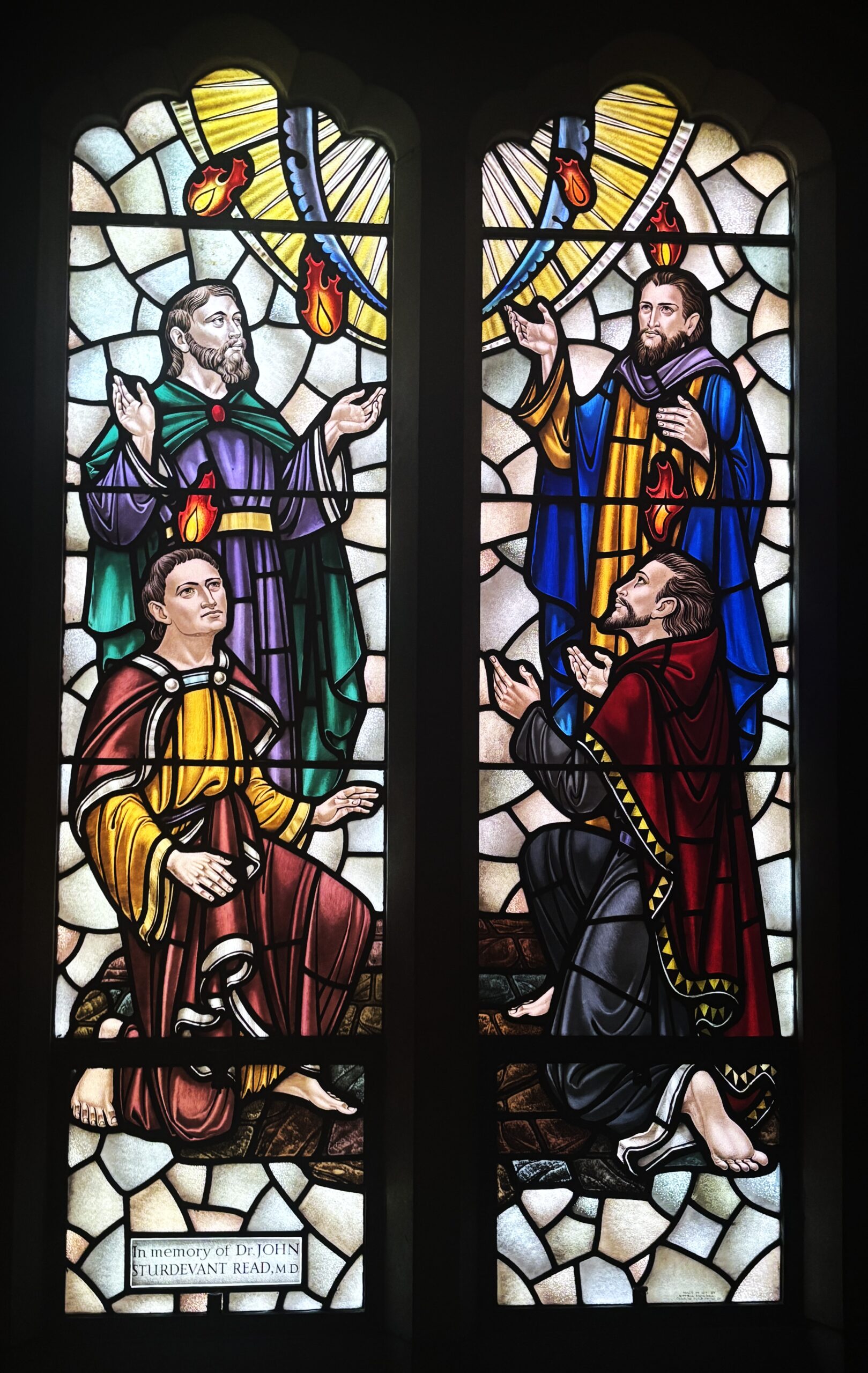Las vidrieras de San Pablo, a menos que se indique lo contrario, fueron diseñadas y producidas por Whipple-Mowbray and Company de Exeter, Inglaterra. Todas son de vidrio emplomado y de color, y se instalaron a partir de 1968. A lo largo de los años, han sido donadas en memoria y honor de familiares y seres queridos de los feligreses. Puede hacer clic o tocar en cualquier imagen de abajo para ver más de cerca cada ventana.