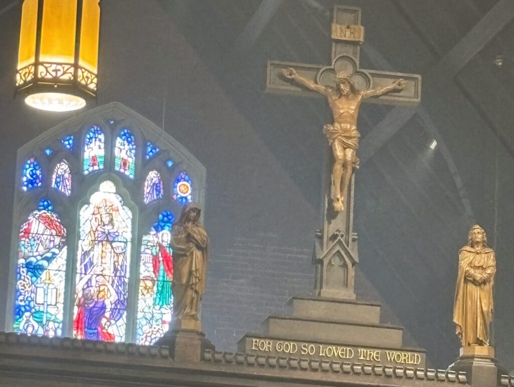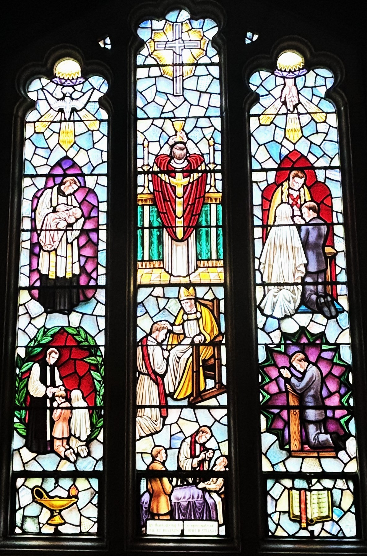 En la pared norte del crucero se encuentra la ventana que representa los siete sacramentos de la Iglesia: La Eucaristía ocupa el lugar central, como en la vida de la Iglesia, rodeada por el Bautismo, la Confirmación, el Matrimonio, el Orden, la Penitencia y la Unción (también conocida como la Extremaunción). Una corona de laurel rodea la Confirmación, símbolo de la victoria sobre uno mismo y el pecado, y una corona de espinas estilizada rodea la Penitencia, para recordarnos la agonía y el sacrificio de Cristo, que fue y es causado por nuestros pecados. Sobre los sacramentos hay representaciones simbólicas de la Trinidad: la Mano de Dios, la Cruz de Cristo y la Paloma del Espíritu Santo.
